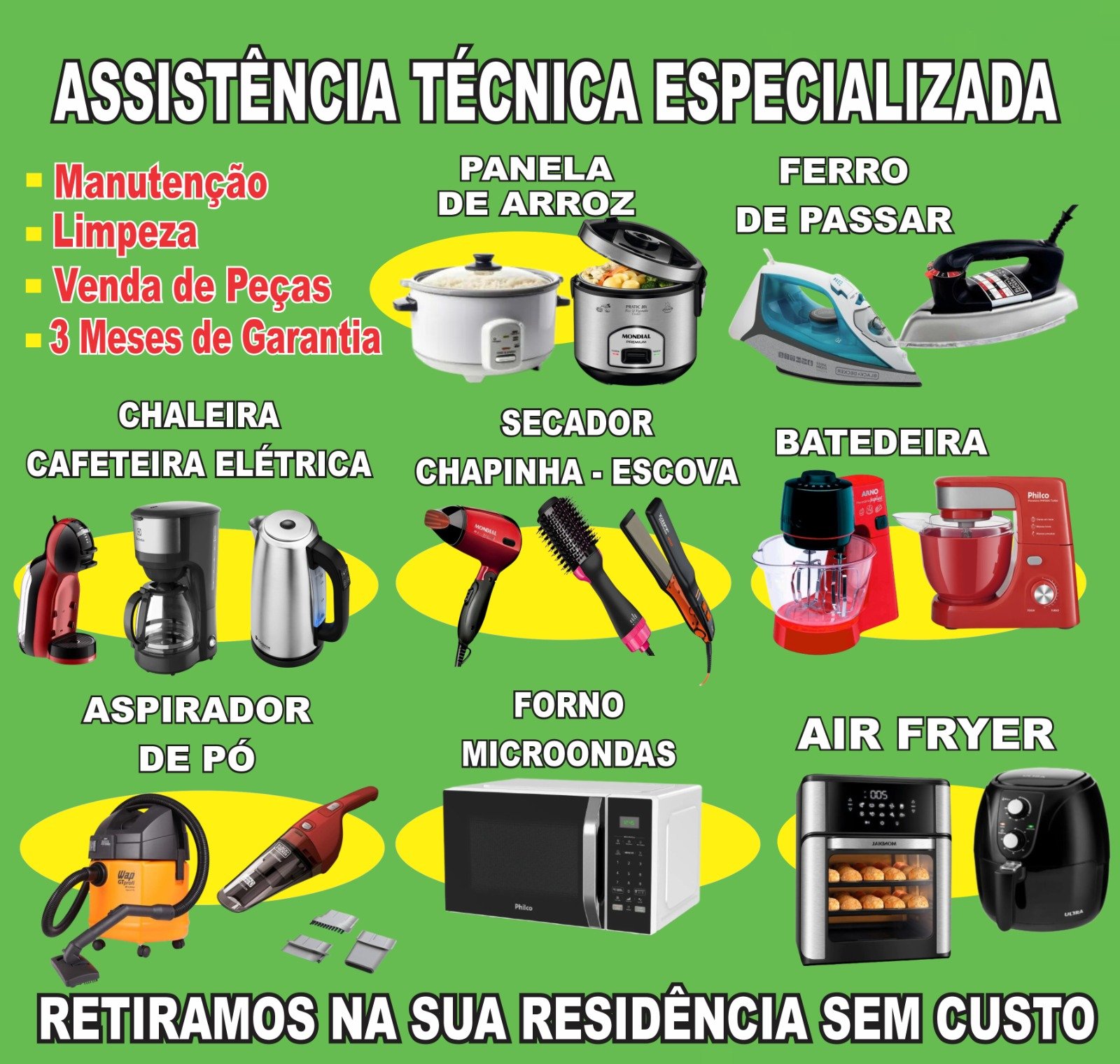 Ventilador de Teto, Ventiladores em Geral, Microondas, Forninho, Forno Elétrico, Air Fryer, Panelas Elétricas, Panificadoras, Chaleiras, Batedeira, Cafeteira, Ferro Elétrico, Ferro a Vapor, Liquidificador, Sanduicheira, Multiprocessador, Secador de Cabelo, Chapinhas, Aspirador de Pó e muito mais!